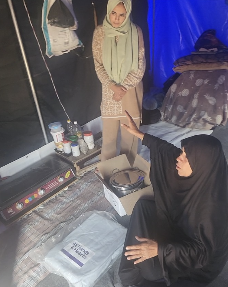 During a field visit, the AH&H team found them living in extremely harsh and unsafe conditions. In response, essential items, including blankets, tarps, water jerry cans, and kitchen sets, were provided to help them cope. These gave Kaenat a new lifeline, as she had no functioning kitchen and could not afford to replace anything.
