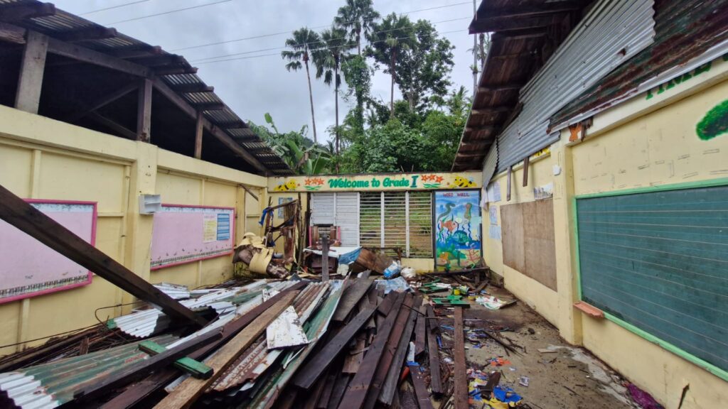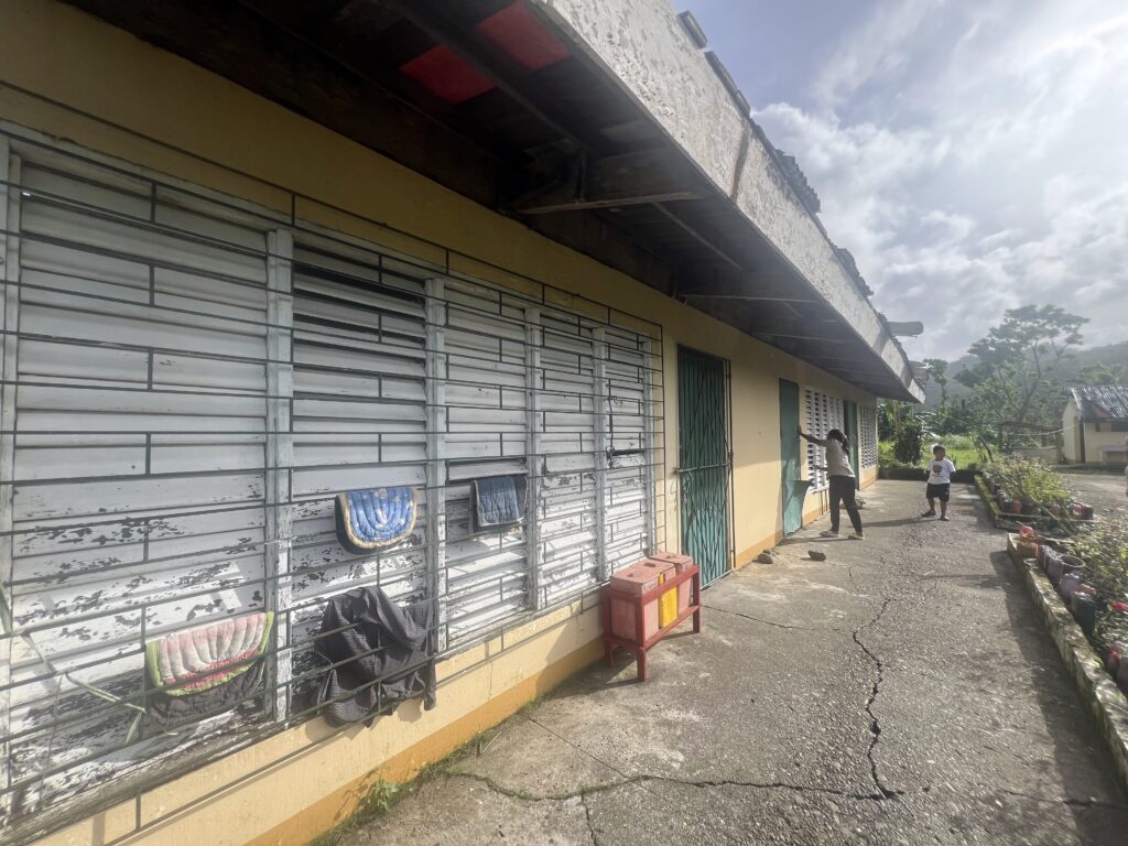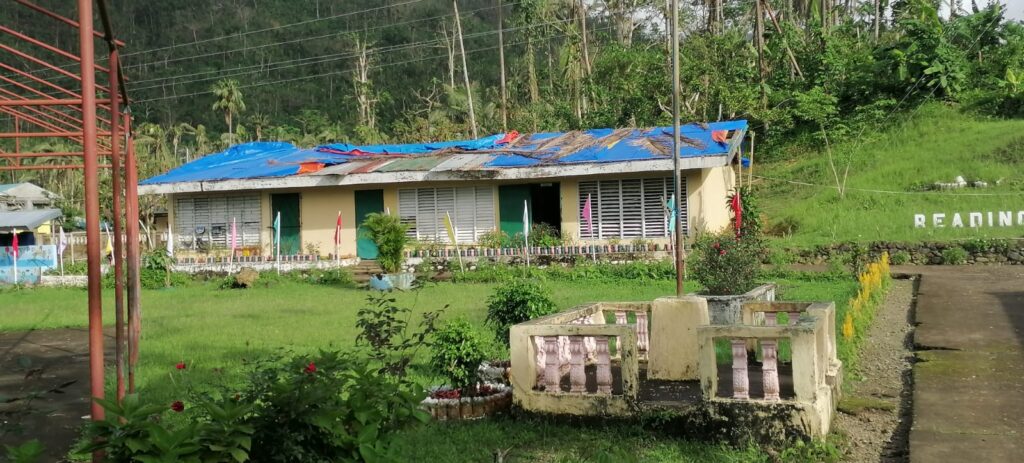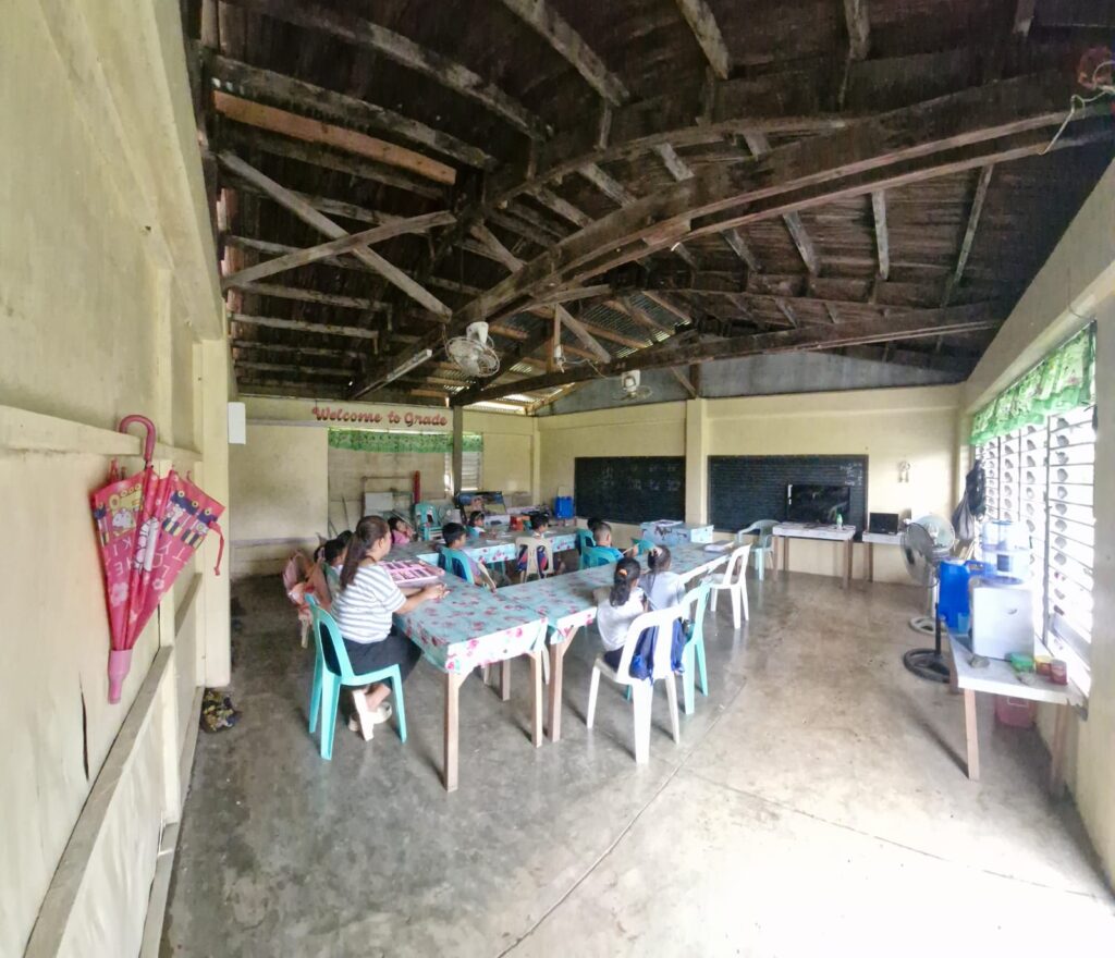 Today, the school includes a mix of aging permanent buildings from the 1970s, unsafe structures no longer in use, and makeshift classrooms and canteen spaces pressed into service for young learners. These conditions make consistent, safe learning difficult, especially as typhoons continue to intensify.