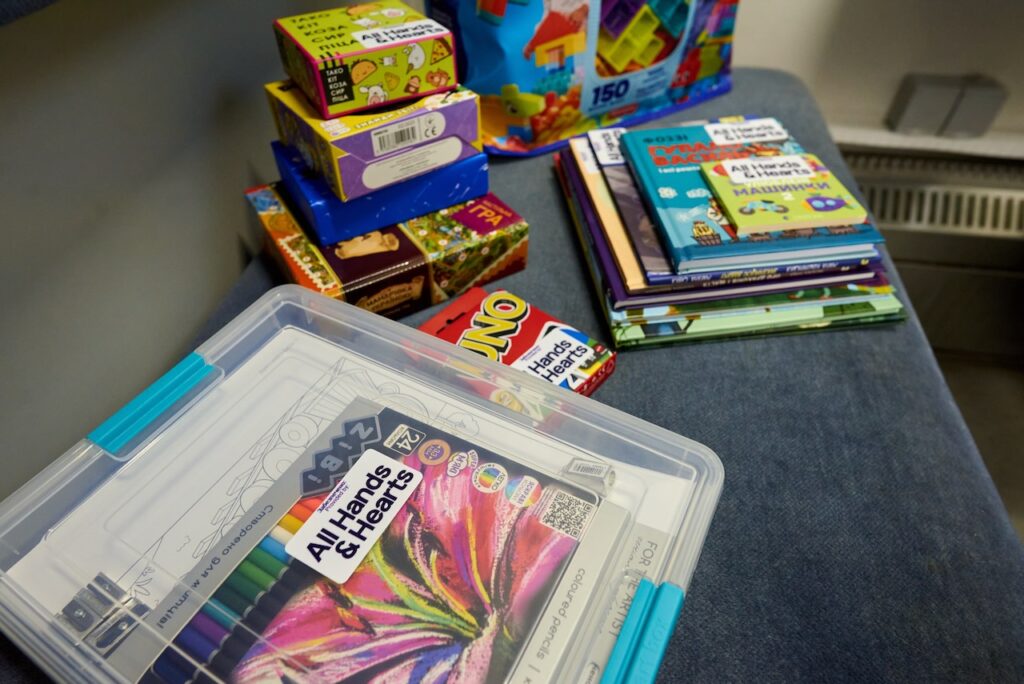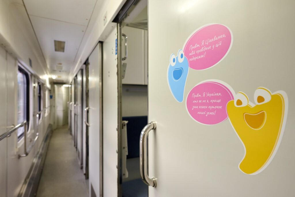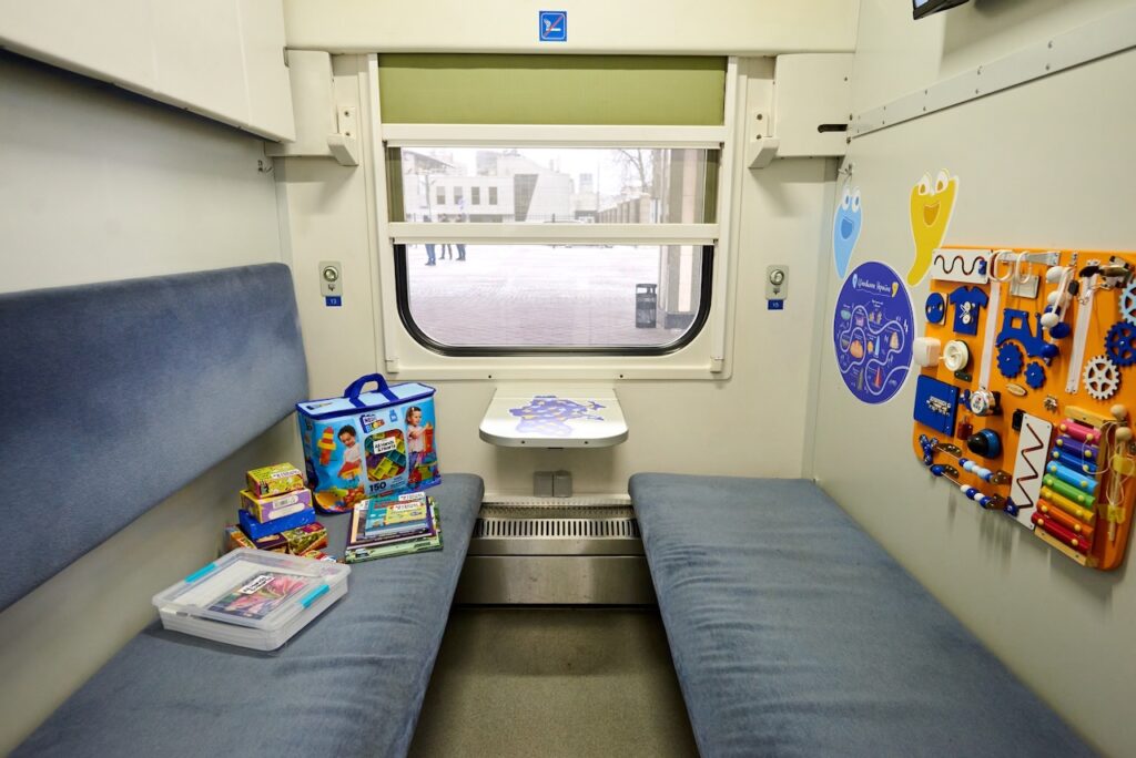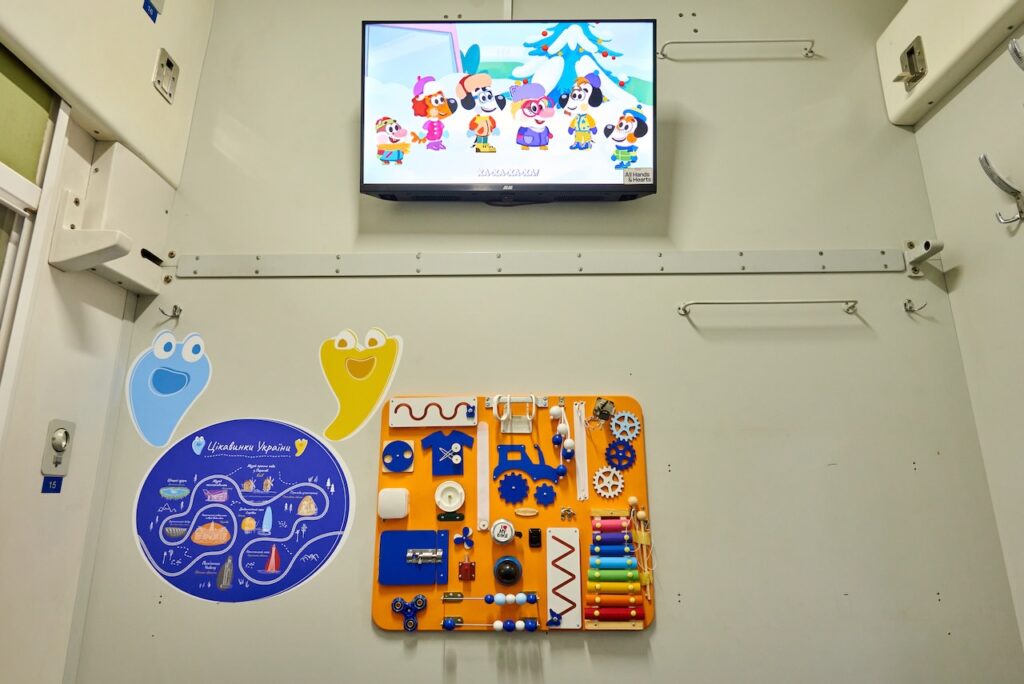 Each train car includes a dedicated children’s compartment, complete with games, books, educational materials, and a TV for watching cartoons or Sesame Street, giving young people a safe space to play and rest amid ongoing uncertainty.